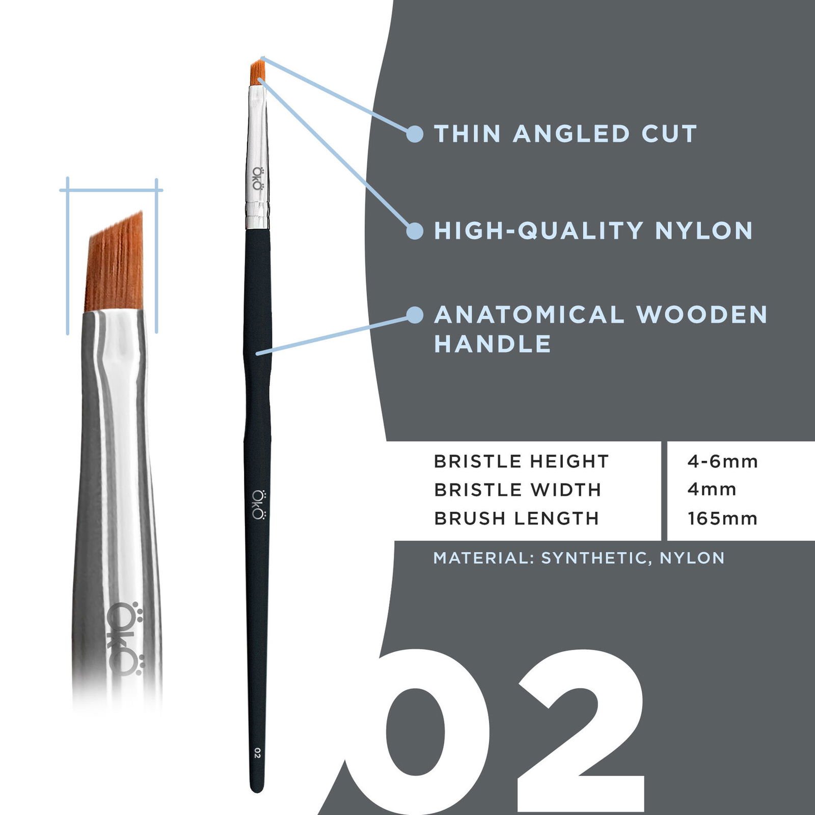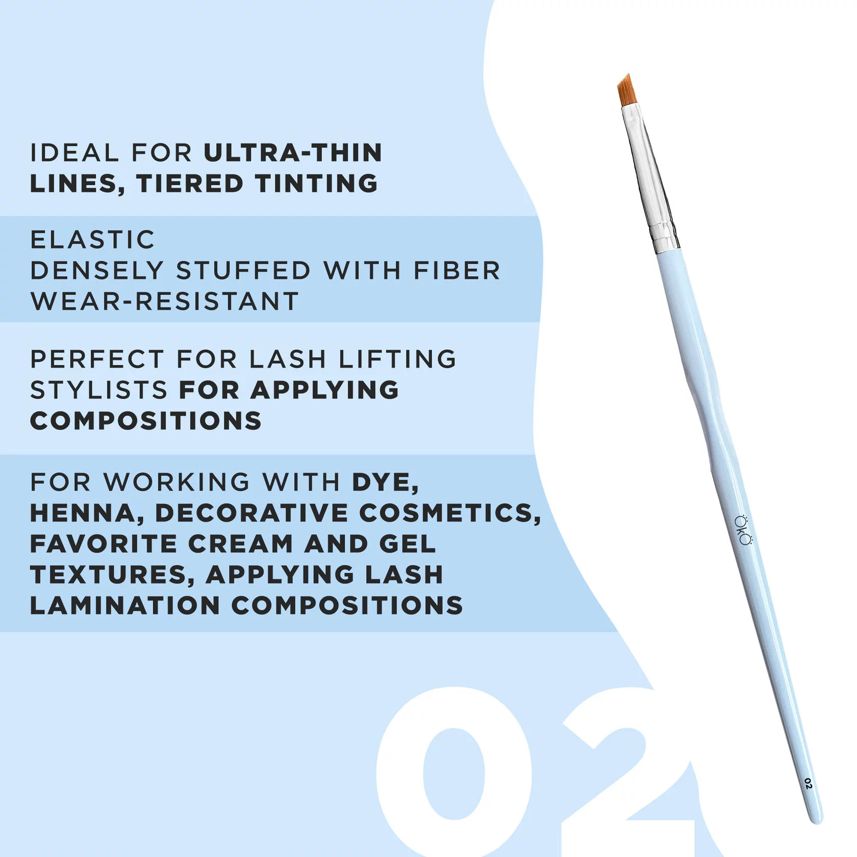 OkO Brush No.2: Ideal for drawing ultra-fine lines and tiered tinting. The size and shape of the brush allows you to get to the most difficult-to-reach areas of the eyebrows without touching the hairs.